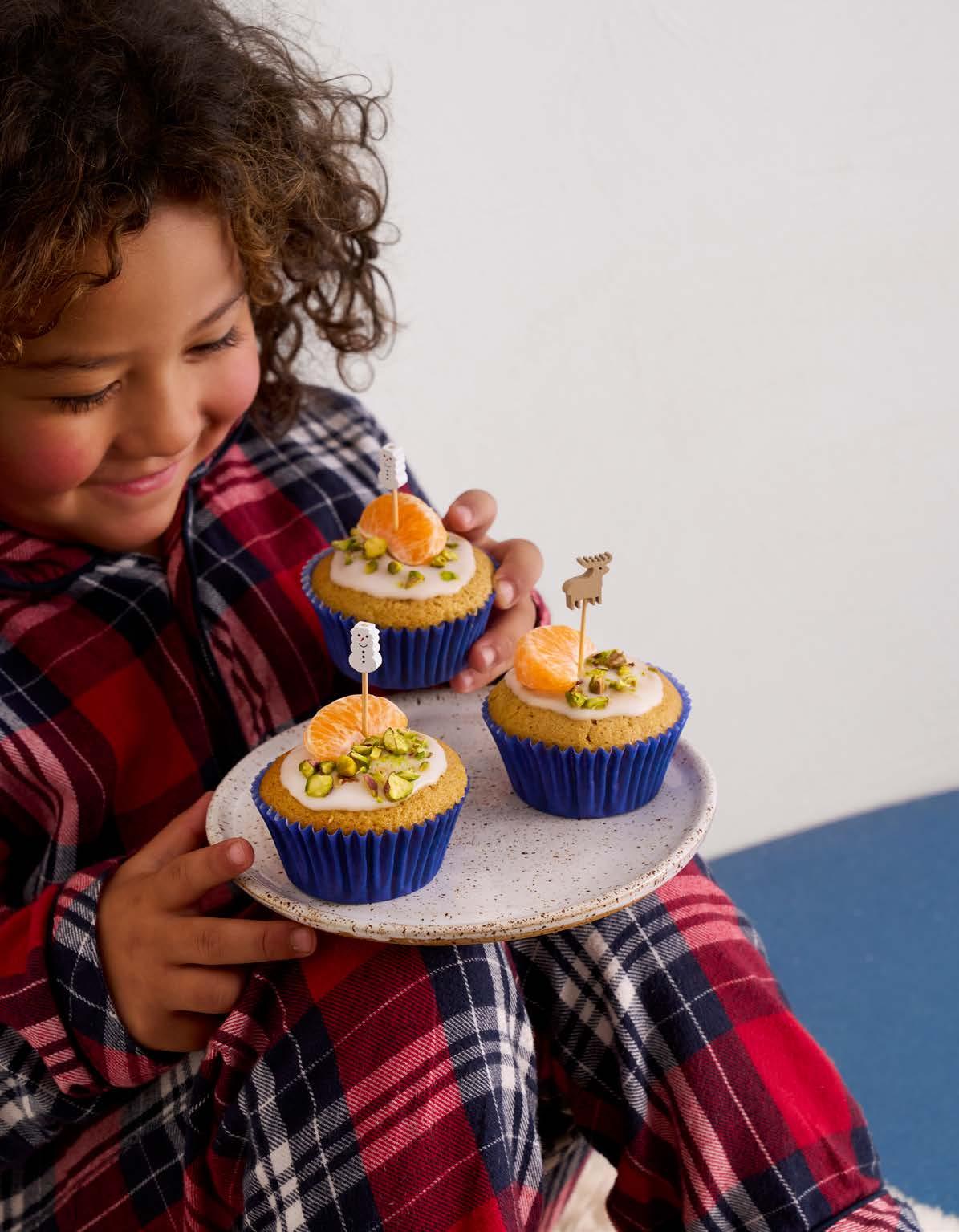 1 Verwarm de oven voor op 200°C. 2 Rasp de schil van de citroenen en pers ze. Pers ook de helft van de mandarijntjes. 3 Doe de margarine (op kamertemperatuur) bij de suiker en meng tot een gladde massa. Klop er dan 1 voor 1 de eieren onder. 4 Voeg de bloem en het bakpoeder toe en meng goed. Voeg het sap en de zeste toe en klop het deeg goed door. Verdeel het deeg over de vormpjes en plaats 15 à 18 min. in de voorverwarmde oven. 5 Meng de bloemsuiker met enkele druppels water. 6 Werk de afgekoelde cupcakes af met het glazuur, pistachenoten en partjes mandarijn.