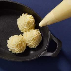 Verwarm de oven voor op 180 °C. Doe de puree in een spuitzak en spuit in elk ovenschaaltje enkele toefjes puree. Verdeel er ook wat stukjes boter over.