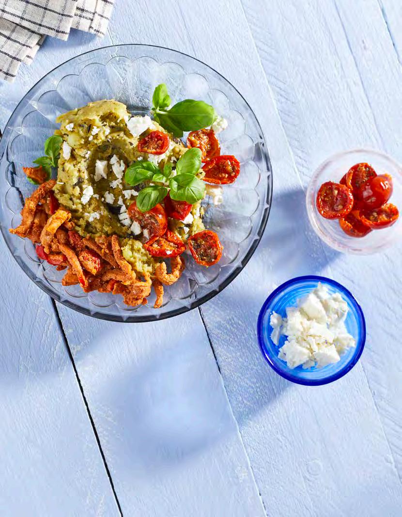 1 Kook de aardappelen gaar in 20 min. Giet ze af en stamp tot een puree. 2 Hak de olijven fijn en meng ze samen met de groene pesto en de oregano onder de puree. 3 Verhit de olijfolie in een pan en bak de gyros gaar. 4 Leg alles op een bord en versier met kerstomaatjes, feta en verse basilicum.
