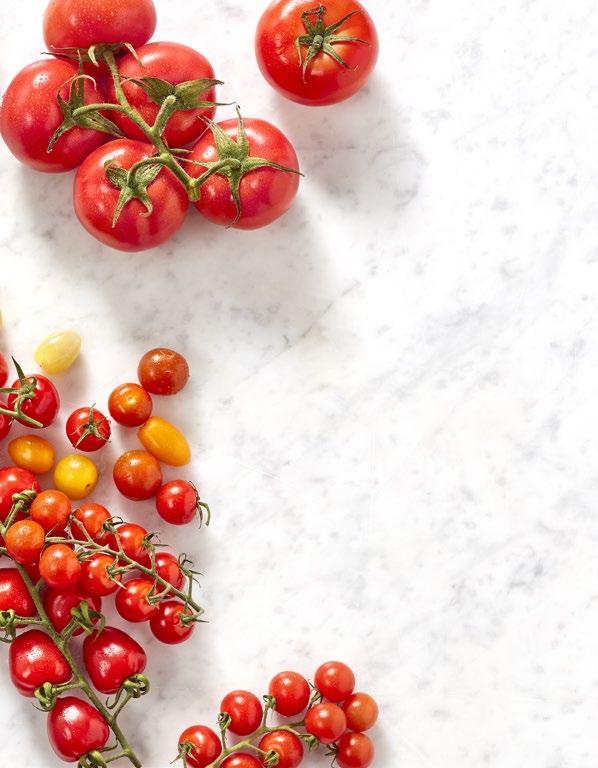 80 G DE TOMATES CERISES ROUGES • 80 G DE TOMATES BONBONS ORANGE • 60 G DE POIVRON VERT • 50 G D’OIGNON ROUGE