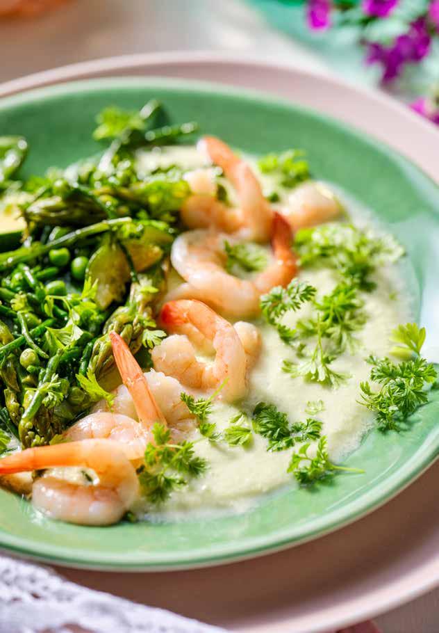 33 Crème d’ajo blanco aux légumes de printemps et crevettes cocktail