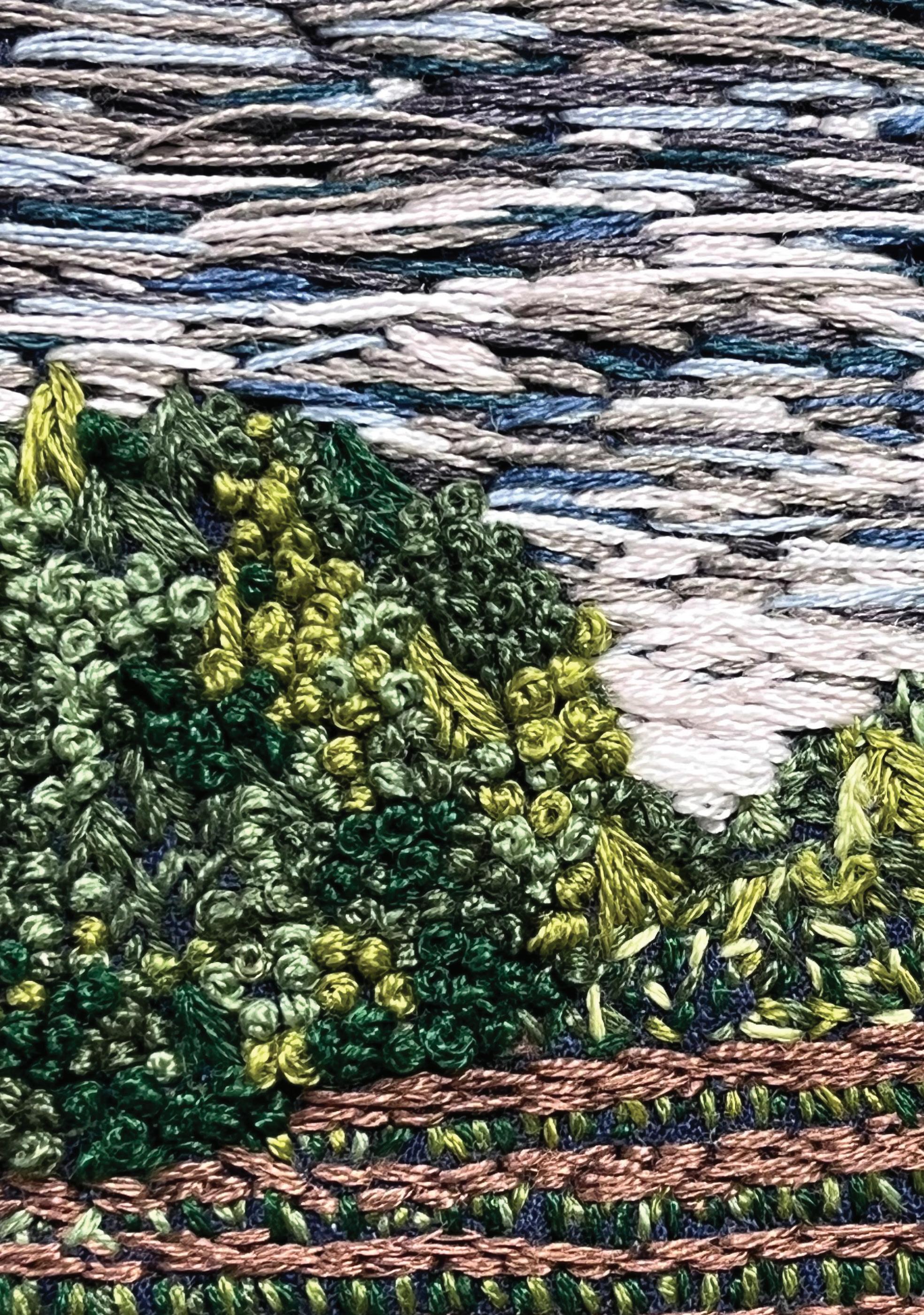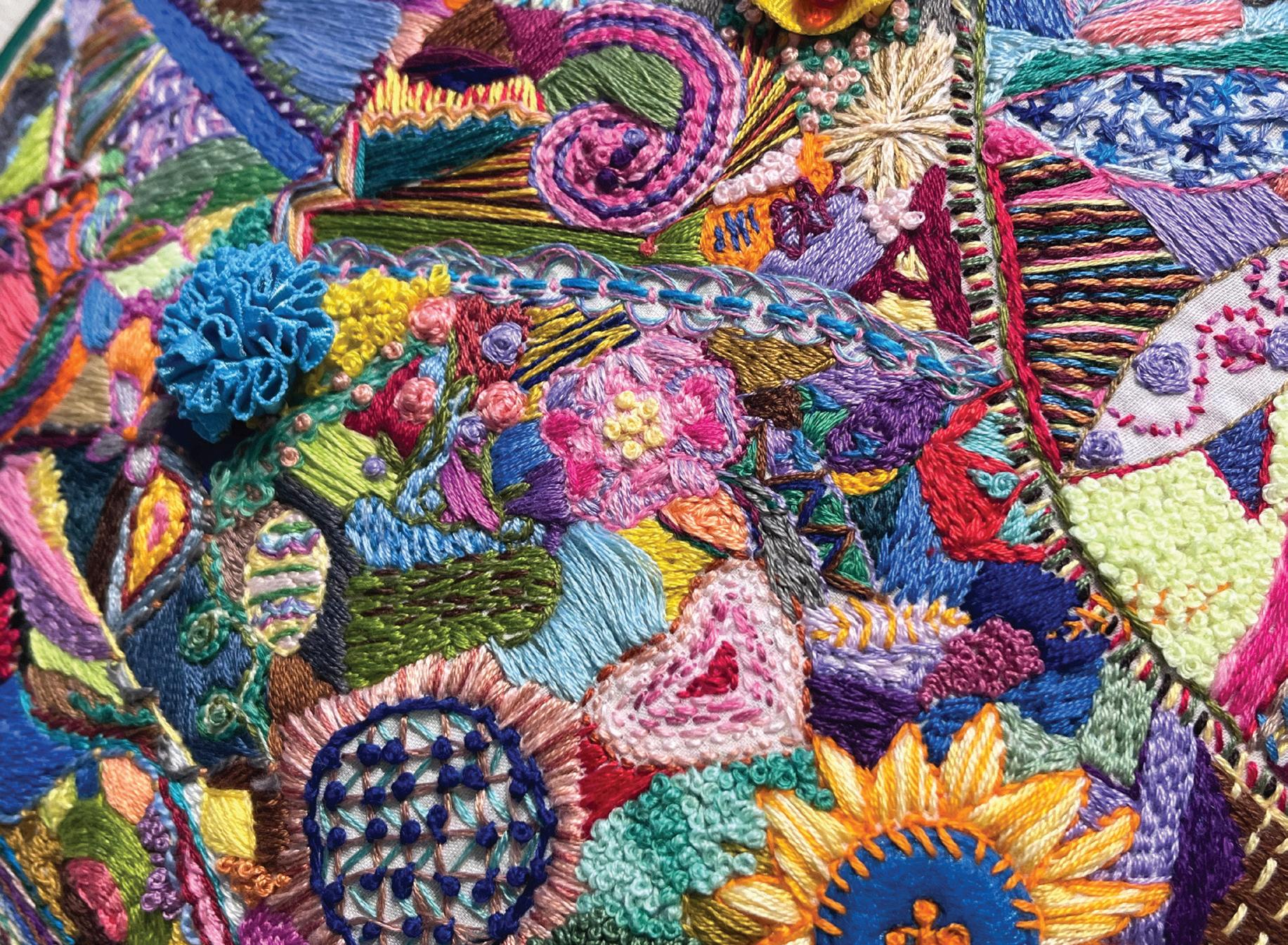 Embroidery is defined as the art of working raised and ornamental designs in threads of silk, cotton, gold, silver, or other material upon any woven fabric, leather, paper, etc., with a needle (dictionary.com). The artist’s work exemplifies the hand of a master at her craft. The combinations of texture and color dance across the surface, telling a story with each beautiful thread. Thank you for sharing your fervor for this medium and for revealing your ability to express yourself with a tenderness and care that is obvious with every stitch.
