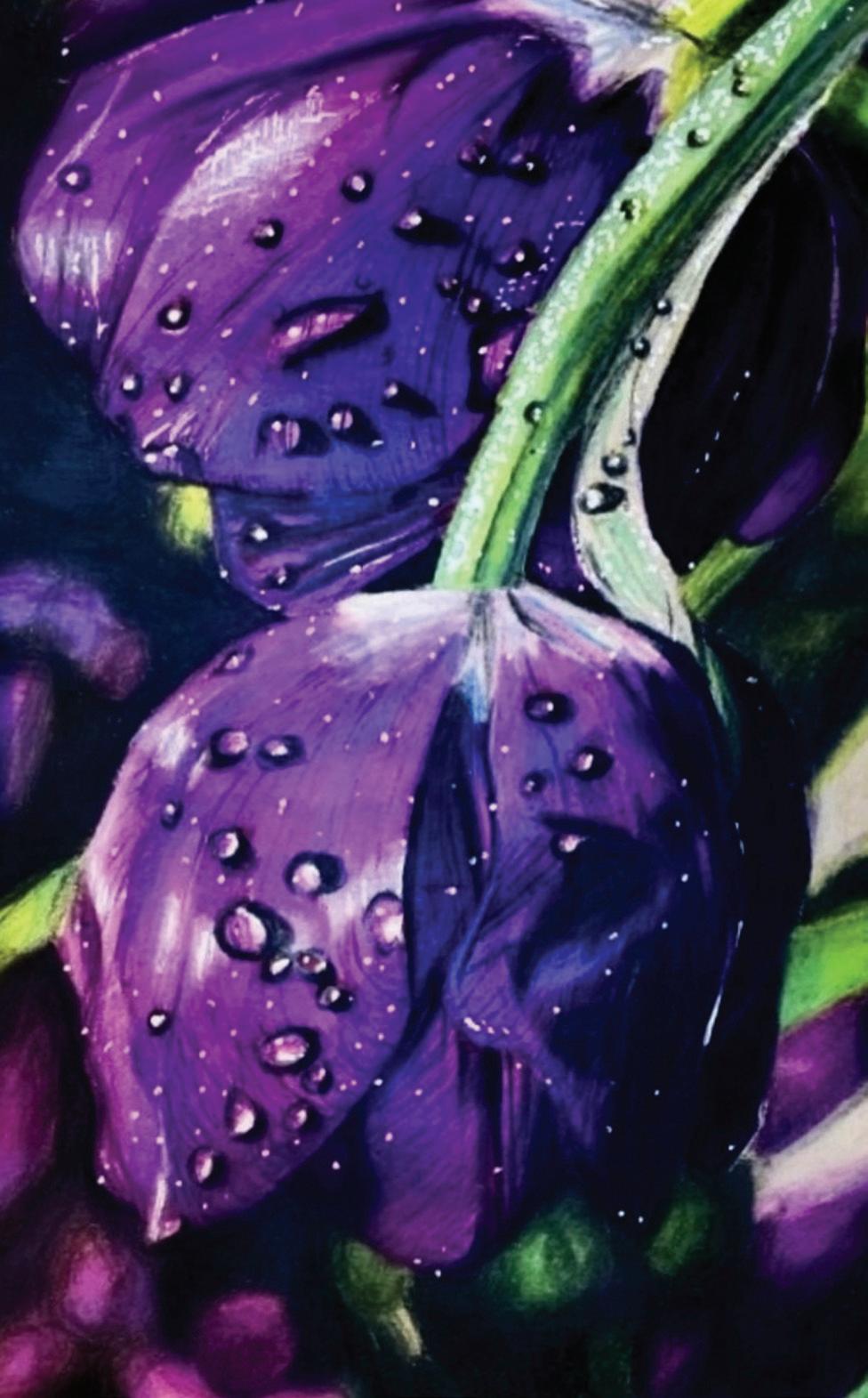 Although colored pencil may be considered a somewhat difficult medium to control, the artist’s technique and skill are a beautiful testament to photorealism. These works are dynamic and powerful. Each layer reveals the artist’s ability to control the blending of colors to create a rich image of complexity and depth. The shadows and highlights move across the surface of the compositions, revealing the natural form and shape of these organic objects. I was immediately captivated by the artist’s ability to see the world through the lens of realism and to capture the exquisite nature of these petals.