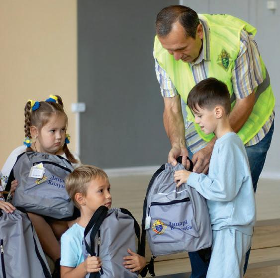 Un membre du Conseil 17652 Blessed Hryhorij Lakota à Lviv donne aux élèves des sacs à dos de marque CdeC remplis de fournitures scolaires. La distribution faisait partie de l’initiative de la rentrée scolaire du conseil d’État, réalisée avec l’aide du Fonds de solidarité pour l’Ukraine, visant à aider les enfants touchés par la guerre.