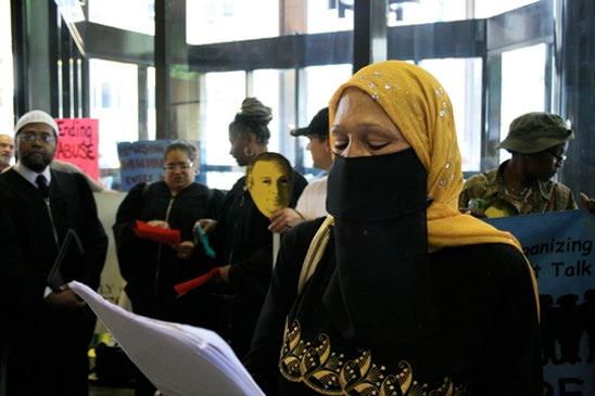 Left,TylethaSamuelsandMohammedSiagha,PTHSheltercampaignconfronting DHSCommissionerLindaGibbsaboutnewlyannouncedrentalsubsidyprogram. May31,2005. PTH Shelter campaign.May31,2005