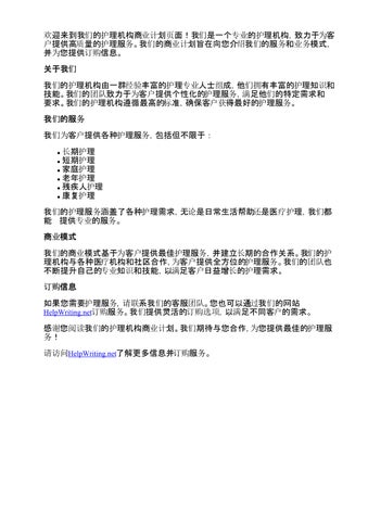 欢迎来到我们的护理机构商业计划页面!我们是一个专业的护理机构,致力于为客 户提供高质量的护理服务。我们的商业计划旨在向您介绍我们的服务和业务模式, 并为您提供订购信息。