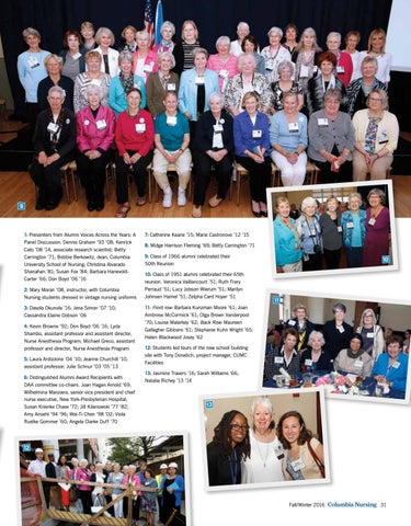 1: Presenters from Alumni Voices Across the Years: A Panel Discussion: Dennis Graham ’93 ’08; Kenrick Cato ’08 ’14, associate research scientist; Betty Carrington ’71; Bobbie Berkowitz, dean, Columbia University School of Nursing; Christina Alvarado Shanahan ’81; Susan Fox ’84; Barbara HanevoldCarter ’66; Don Boyd ’06 ’16 2: Mary Moran ’08, instructor, with Columbia Nursing students dressed in vintage nursing uniforms 3: Dasola Okunola ’16; Jena Simon ’07 ’10; Cassandra Elaine Dobson ’06 4: Kevin Browne ’92; Don Boyd ’06 ’16; Lyda Shambo, assistant professor and assistant director, Nurse Anesthesia Program; Michael Greco, assistant professor and director, Nurse Anesthesia Program 5: Laura Ardizzone ’04 ’10; Jeanne Churchill ’10, assistant professor; Julie Schnur ’03 ’05 ’13 6: Distinguished Alumni Award Recipients with DAA committee co-chairs. Joan Hagan Arnold ’69; Wilhelmina Manzano, senior vice president and chief nurse executive, New York-Presbyterian Hospital; Susan Krienke Chase ’72; Jill Kilanowski ’77 ’82; Amy Ansehl ’94 ’96; Wei-Ti Chen ’98 ’02; Viola Ruelke Gommer ’60; Angela Clarke Duff ’70