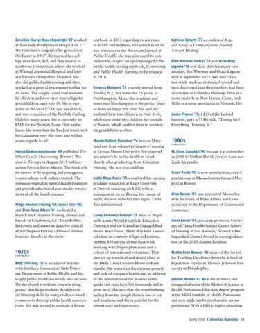 Tenafly, N.J., her home for 25 years, to Northampton, Mass. She is retired and notes that Northampton is the perfect place to work or enjoy free time. She and her husband have two children in New York, while their other two children live outside of Boston, which enables them to see their six grandchildren often. Marsha Gottlieb Bronsther ’74 lives in Maryland and is an adjunct professor of nursing at George Mason University. She received her master’s In public health in Israel shortly after graduating from Columbia Nursing. She has four children.