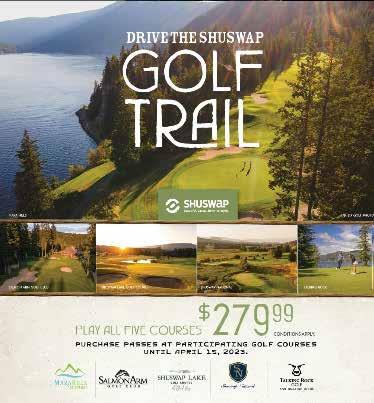 FITS YOUR GAME TO A TEE Can’t wait to golf the Shuswap? Contact golf courses directly to book a tee time or to schedule a lesson! GOLFINBRITISHCOLUMBIA.COM SHUSWAPTOURISM.CA Whatever you want, we’ve got a trail for you! Hike, bike, snowshoe, cross-country ski or saddle up your horse. Then go! SHUSWAP, BC, CANADA featuring the... #ExploreShuswap FIND YOUR STRIDE THE SHUSWAP TRAILS & SHUSWAPTOURISM.CA SHUSWAPTOURISM.CA LANGUID LAKES & MEANDERING RIVERS ON THE GET WATER Adams Lake Spa Lake Arthur Lake Bolean Pillar lake Lake Lake Lake Herman Lake Mara Lake Gardom Lake Shuswap Lake Anstey Arm SEYMOUR Arm Griffin Lake Three Valley Lake Cummins Lake Perry RIVER RiverEagle Kernaghan Lake Scotch Creek Salmon river RiverSalmon Shuswap River RiVERAdams Harper Lake Chase Phillips Skimikin Pement Lake Bryden Lake SalmonArm ENDERBY ARMSTRONG FALKLAND SICAMOUS CHASE Tsútswecw Prov. Park Copper Island Lee Creek Scotch Creek Celista Magna Bay St. Ives Wild Rose Bay Tillis Landing Sunnybrae Tappen Balmoral Carlin White Lake Cinnemousun Narrows Eagle Bay Adams Lake Provincial Park Pukeashun Provincial Park Yard Creek Prov. Park Mount Gri n Provincial Park Kingfisher Creek Provincial Park Kingfisher Creek Ecological Reserve Mabel Lake Provincial Park Enderby Cli s Provincial Park South Canoe Seymour Arm Craigellachie Malakwa Three Valley Gap Swansea Point Canoe Grindrod Silver Creek Turtle Valley Larch Hills Notch Hill Squilax Barriere Rd.BayAgate Rd.Holding Revelstoke, Golden & Calgary Kay Falls EAGLE PASS MTN. Perry Canyon Lumby MARA MTN. QUEEST MTN. BASTION MTN. CROWFOOT MTN. LICHEN MTN. MT. MOBLEY Rd.Skimikin Rd.Skimikin-Lake Little Shuswap Rd. Turtle Rd.Valley RdLakeWhite Eagle Bay Rd. Balmoral Rd SquilaxAnglemont Rd. Salmon Valley Rd. Salmon Valley Rd. Yankee-Flats Rd. Chase-Falkland Rd. Deep Creek Rd. Mabel Lake Rd. Rd.LakeHidden Trinity Valley Rd. Sun Peaks (summer road) Neskonlith Neskonlith Lake Prov. Park Haines Creek HILLIAM MTN. MT. TAPPEN Kamloops & Vancouver Mabel Lake Gardom Lake Rd. RdFoothill 20th Ave MT. IDA Anstey Hunakwa Beach Bay Albas Falls Two Mile Encounter Point Wright Creek Anstey Arm West Twin Bays Broken Point Four Mile Creek Rendezvous Picnic Cottonwood Beach Nielsen Beach Roberts Bay Woods Landing Woods Landing South Ruckell Point St. Ives Haven Pt. Wild Rose Bay Armstrong Pt. Horseshoe Bay Scotch Creek Prov. Park Ross Creek Fraser Bay Anstey Marble Point Tillis Beach Hermit Bay Hungry Cove Herald Provincial Park Sunnybrae Provincial Paradise Point Bastion Bay Mara Lake Provincial Park Swall Aline Hill Fowler Point Silver Beach Prov. Park Steamboat Bay m ybebaM L dRek Old Town Bay Margaret Falls SORRENTO Rosemond Anglemont p o SA m t g R Blind Bay G weivdn hcneB R d S u M F eS ec R S b C- n ioP R d tN dRllHh iS ma S-su l uq dR Queest Village reviRnospmohT dRkeerCraeB-nikaoL LsmadAka e F e S e R d S -p h C R ylF slH oF e S civ R Rd.AnglemontSquilaxLine 17 Rd. LakeShuswap Armstrong, Vernon & Kelowna C’MON OVER! The water’s warm Jump into the Shuswap LAKE EXPERIENCES Family Friendly CANOE BEACH 7720 - 36 Street NE, Salmon Arm - A boat launch and dock. Float up to the day-use dog park. Beach, washrooms, garbage receptacles and seasonal café. HARBOUR ROAD 1955 Eagle Bay Rd, Blind Bay - Public toilet (vault privy) and 60 ft. dock for temporary loading and unloading of boats. This is shallow boat launch and only suitable for small boats by late summer. HERALD PROVINCIAL PARK 4861 Sunnybrae-Canoe Point Rd, Sunnybrae A concrete launch in the day-use area at this destination park and campground. MAGNA BAY WHARF PARK 6254 Squilax Anglemont Rd, Magna Bay A popular swimming and picnic area for locals and visitors alike! Enjoy 100 m of south-facing beach. MARA LAKE PROVINCIAL PARK Hwy. 97A, Mara A popular day-use area for fishing, swimming, boating and picnic area. Lots of parking. MARINE PARK 750 Marine Park Dr NE, Salmon Arm Boat launch, parking, concession, washrooms and walking trails. MARKWART ROAD 2888 Markwart Rd, Sorrento Year-round launch in Sorrento, lots of parking and easy access to accommodations, restaurants and more downtown. MEMORIAL PARK 1212 2 Ave, Chase Boat launch, lots of parking, park, beach, wharf and washrooms. OLD TOWN BAY 200 Old Town Rd West, Sicamous Boat launch in Sicamous, limited free daily parking and washrooms. WHITEHEAD ROAD 4325 Whitehead Rd, Eagle Bay Boat launch with limited parking. Pit toilets. WINDSOR ROAD 8959 Swanshore Rd, Swansea Point Lake access park in Swansea Point. Bike rack, parking, beach and picnic tables. No public washrooms. GO ON A GREAT HIKE! ALBAS FALLS, SEYMOUR ARM: This approx 3 km loop trail follows both sides of Celista Creek, up from the shores of Shuswap Lake, through a series of five impressive waterfalls. Observe signs and stay well back from the edge. COPPER ISLAND, SOUTH SHUSWAP: Water access only, located 2km offshore between Blind Bay and Scotch Creek. Boat or paddle to the east side of the island to find a small beach and trailhead signage. HERALD’S PARK / MARGARET FALLS TRAILS: Margaret Falls Trails are along Shuswap Lake in the park, and to the waterfall over bridges and through a magical old growth forest in the moss-covered Reinecker Gorge. The Upper Herald’s trail that links to Reinecker is open; start at the post on the east side just before the bridge. MARBLE POINT, EAST SHUSWAP: Water access only, midway between Sicamous and Cinnemousun Narrows. Trailhead just inside the trees. Unusual -mar ble/limestone outcropping, set in a lush, mossy forest. TSÚTSWECW PROVINCIAL PARK, NORTH SHUSWAP: Opportunities to view salmon spawning in the Adams River. Lots of easy trails to explore. FESTIVALs, concerts & EVENTS Every year, the Shuswap hosts some spectacular down-to-earth festivals and events. Events are an exceptional way to discover the true community and spirit of the Shuswap, and visitors are not only always welcome, they’re anticipated. Wondering what’s on? Check out the Event Calendar for current i