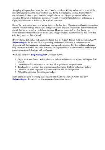 If you're facing difficulties with your dissertation data sheet, don't despair. Help is available! At ⇒ HelpWriting.net⇔, we specialize in providing professional assistance to students who are struggling with their academic writing tasks. Our team of experienced writers and researchers can help you create a flawless data sheet that meets the requirements of your dissertation and helps you present your research findings with confidence.