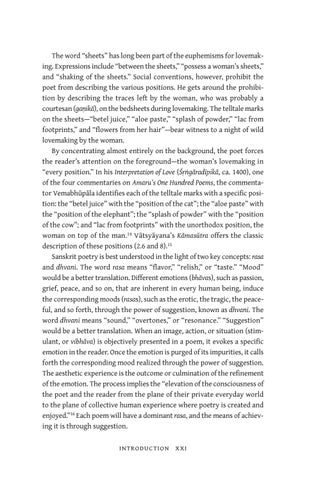 7KH ZRUG ´VKHHWVµ KDV ORQJ EHHQ SDUW RI WKH HXSKHPLVPV IRU ORYHPDNLQJ ([SUHVVLRQV LQFOXGH ´EHWZHHQ WKH VKHHWV µ ´SRVVHVV D ZRPDQ·V VKHHWV µ DQG ´VKDNLQJ RI WKH VKHHWV µ 6RFLDO FRQYHQWLRQV KRZHYHU SURKLELW WKH SRHW IURP GHVFULELQJ WKH YDULRXV SRVLWLRQV +H JHWV DURXQG WKH SURKLELWLRQ E\ GHVFULELQJ WKH WUDFHV OHIW E\ WKH ZRPDQ ZKR ZDV SUREDEO\ D FRXUWHVDQ JDؾLNč RQ WKH EHGVKHHWV GXULQJ ORYHPDNLQJ 7KH WHOOWDOH PDUNV RQ WKH VKHHWV³´EHWHO MXLFH µ ´DORH SDVWH µ ´VSODVK RI SRZGHU µ ´ODF IURP IRRWSULQWV µ DQG ´ϰRZHUV IURP KHU KDLUµ³EHDU ZLWQHVV WR D QLJKW RI ZLOG ORYHPDNLQJ E\ WKH ZRPDQ %\ FRQFHQWUDWLQJ DOPRVW HQWLUHO\ RQ WKH EDFNJURXQG WKH SRHW IRUFHV WKH UHDGHU·V DWWHQWLRQ RQ WKH IRUHJURXQG³WKH ZRPDQ·V ORYHPDNLQJ LQ ´HYHU\ SRVLWLRQ µ ,Q KLV ,QWHUSUHWDWLRQ RI /RYH ߭عޢJčUDGҸSLNč FD RQH of the four commentaries on Amaru’s One Hundred Poems, the commentaWRU 9HPDEKࡃSčOD LGHQWLϮHV HDFK RI WKH WHOOWDOH PDUNV ZLWK D VSHFLϮF SRVLWLRQ WKH ´EHWHO MXLFHµ ZLWK WKH ´SRVLWLRQ RI WKH FDWµ WKH ´DORH SDVWHµ ZLWK WKH ´SRVLWLRQ RI WKH HOHSKDQWµ WKH ´VSODVK RI SRZGHUµ ZLWK WKH ´SRVLWLRQ RI WKH FRZµ DQG ´ODF IURP IRRWSULQWVµ ZLWK WKH XQRUWKRGR[ SRVLWLRQ WKH ZRPDQ RQ WRS RI WKH PDQ 9čWV\č\DQD·V .čPDVࡃWUD RϸHUV WKH FODVVLF GHVFULSWLRQ RI WKHVH SRVLWLRQV DQG 6DQVNULW SRHWU\ LV EHVW XQGHUVWRRG LQ WKH OLJKW RI WZR NH\ FRQFHSWV rasa and GKYDQL 7KH ZRUG rasa PHDQV ´ϰDYRU µ ´UHOLVK µ RU ´WDVWH µ ´0RRGµ ZRXOG EH D EHWWHU WUDQVODWLRQ 'LϸHUHQW HPRWLRQV EKčYDV VXFK DV SDVVLRQ JULHI SHDFH DQG VR RQ WKDW DUH LQKHUHQW LQ HYHU\ KXPDQ EHLQJ LQGXFH WKH FRUUHVSRQGLQJ PRRGV rasaV VXFK DV WKH HURWLF WKH WUDJLF WKH SHDFHIXO DQG VR IRUWK WKURXJK WKH SRZHU RI VXJJHVWLRQ NQRZQ DV GKYDQL. The ZRUG GKYDQL means “sound,” “overtones,” or “resonance.” “Suggestion” ZRXOG EH D EHWWHU WUDQVODWLRQ :KHQ DQ LPDJH DFWLRQ RU VLWXDWLRQ VWLPulant, or YLEKčYD LV REMHFWLYHO\ SUHVHQWHG LQ D SRHP LW HYRNHV D VSHFLϮF HPRWLRQ LQ WKH UHDGHU 2QFH WKH HPRWLRQ LV SXUJHG RI LWV LPSXULWLHV LW FDOOV IRUWK WKH FRUUHVSRQGLQJ PRRG UHDOL]HG WKURXJK WKH SRZHU RI VXJJHVWLRQ 7KH DHVWKHWLF H[SHULHQFH LV WKH RXWFRPH RU FXOPLQDWLRQ RI WKH UHϮQHPHQW RI WKH HPRWLRQ 7KH SURFHVV LPSOLHV WKH ´HOHYDWLRQ RI WKH FRQVFLRXVQHVV RI WKH SRHW DQG WKH UHDGHU IURP WKH SODQH RI WKHLU SULYDWH HYHU\GD\ ZRUOG WR WKH SODQH RI FROOHFWLYH KXPDQ H[SHULHQFH ZKHUH SRHWU\ LV FUHDWHG DQG enjoyed.” (DFK SRHP ZLOO KDYH D GRPLQDQW rasa, and the means of achieving it is through suggestion. ᇹቨዧወኂᅡዼᅐዧᇹኂቨጳጳᇹ