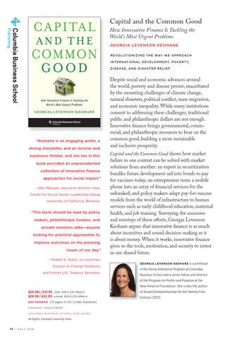 Capital and the Common Good shows how market failure in one context can be solved with market solutions from another: an expert in securitization bundles future development aid into bonds to pay for vaccines today; an entrepreneur turns a mobile phone into an array of financial services for the unbanked; and policy makers adapt pay-for-success models from the world of infrastructure to human services such as early childhood education, maternal health, and job training. Surveying the successes and missteps of these efforts, Georgia Levenson Keohane argues that innovative finance is as much about incentives and sound decision making as it is about money. When it works, innovative finance gives us the tools, motivation, and security to invest in our shared future. GEORGIA LEVENSON KEOHANE