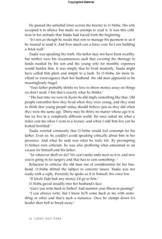 He passed the unfurled letter across the brazier to O-Nobu. His wife accepted it in silence but made no attempt to read it. It was this coldness in her attitude that Tsuda had feared from the beginning. “It’s not as though he needs that rent to manage his payment to us if he wanted to send it. And how much can a fence cost; he’s not building a brick wall.” Tsuda was speaking the truth. His father may not have been wealthy, but neither were his circumstances such that covering the shortage in funds needed by his son and his young wife for monthly expenses would burden him. It was simply that he lived modestly. Tsuda might have called him plain and simple to a fault. To O-Nobu, far more inclined to extravagance than her husband, the old man appeared to be meaninglessly frugal. “Your father probably thinks we love to throw money away on things we don’t need. I bet that’s exactly what he thinks.” “The last time we were in Kyoto he did imply something like that. Old people remember how they lived when they were young, and they tend to think that young people today should behave just as they did when they were the same age. Thirty may be thirty no matter whose age it is, but we live in a completely different world. He once asked me what a ticket cost me when I went to a lecture, and when I told him five yen he looked horrified.” Tsuda worried constantly that O-Nobu would feel contempt for his father. Even so, he couldn’t avoid speaking critically about him in her presence. And what he said was what he truly felt. By preempting O-Nobu’s own criticism, he was also proffering what amounted to an excuse for himself and his father. “So whatever shall we do? We can’t make ends meet as it is, and now you’re going in for surgery and that has to cost something—” Reluctant to criticize the old man out of consideration for her husband, O-Nobu shifted the subject to concrete issues. Tsuda was not ready with a reply. Presently he spoke as if to himself, his voice low. “If Uncle Fujii had any money I’d go to him.” O-Nobu gazed steadily into her husband’s face. “Can’t you write back to Father? And mention your illness in passing?” “I can always write, but I know he’ll come back at me with something or other and that’s such a nuisance. Once he clamps down it’s harder than hell to break away.”