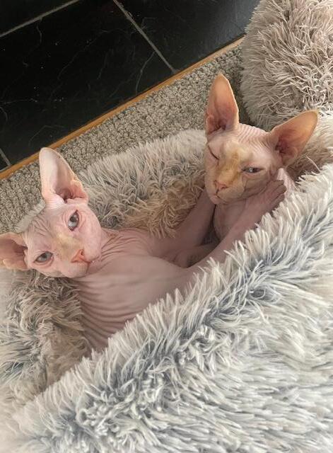 These are our two sphynx sibling cats, Blue and Chip. They’re very hot despite the fact that they have no hair. They’re always at the door to welcome us back home and very chatty.