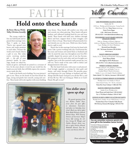 LAKE WINDERMERE ALLIANCE CHURCH Sunday, July 7th 10:30 a.m.: Worship and Life Instruction, “Loving Proverbs: Words From A Wise Guy”. Pastor Trevor ministering. Pastor Trevor Hagan • 326 - 10th Avenue, Invermere 250-342-9535 • www.lakewindermerealliance.org WINDERMERE VALLEY SHARED MINISTRY ANGLICAN-UNITEDπ 9:00 a.m.: Worship at All Saint’s, Edgewater 10:30 a.m.: Worship at Christ Church Trinity, Invermere 7 p.m.: Worship at St. Peter’s, Windermere Reverend Laura Hermakin 110 - 7th Avenue, Invermere 250-342-6644 www.wvsm.ca VALLEY CHRISTIAN ASSEMBLY Sunday, 10 a.m.: Worship and World Kids’ Church provided. Pastor Murray Wittke 4814 Highway 93/95, Windermere 250-342-9511 • www.valleychristianonline.com ROMAN CATHOLIC CHURCH Saturday, 4:30 p.m.: at St. Anthony’s, Canal Flats. Saturday, 5 p.m. and Sunday, 9 a.m.: at Canadian Martyrs’ Church in Invermere. Sunday, 11 a.m.: at St. Joseph’s Church in Radium. Father Gabriel • 712 -12th Ave., Invermere • 250-342-6167 ST. PETER’S LUTHERAN MISSION OF INVERMERE Worship services every Sunday at 1:30 p.m. Christ Church Trinity, 110 - 7th Ave., Invermere Pastor Rev. Fraser Coltman • 1-866-426-7564 RADIUM CHRISTIAN FELLOWSHIP Sunday 10 a.m. Worship service Pastor Wayne and Linda Frater • 250-342-6633 No. 4, 7553 Main St. Radium • 250-347-9937 CHURCH OF JESUS CHRIST OF LATTER-DAY SAINTS Worship Service, Sunday, 10 a.m. • Relief Society, 11:15 a.m. President Barry Pratt • Columbia Valley Branch 5014 Fairway, Fairmont Hot Springs • 250-341-5792