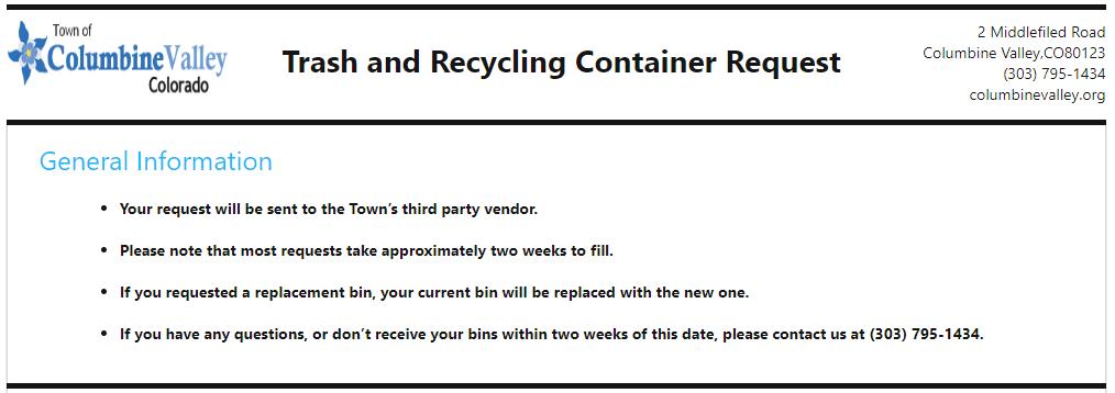 • Trash/Recycling Bins: Visit Columbine Valley.org > Public Works > Trash & Recycling for a link to the online form.