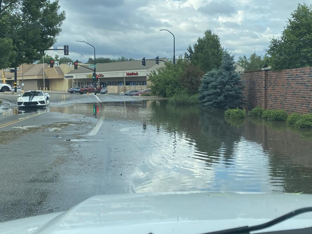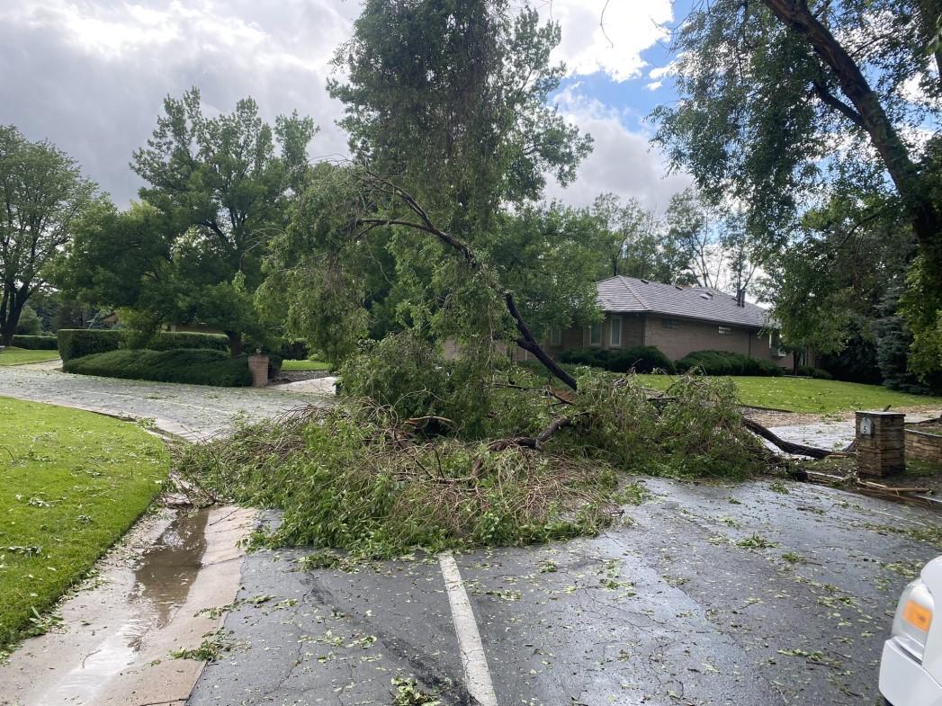 Clockwise from top left: The boardwalk at the Wild Plum stormwater retention ponds after heavy rains. New concrete pans at the intersection of Niblick and Club Lanes. Clogged storm drains (bottom left) and downed trees (middle left) due to rain and hail on June 22.