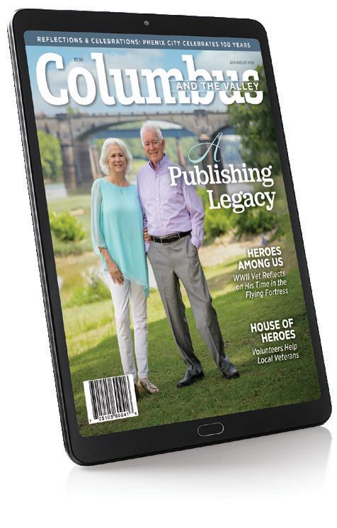 COLUMBUS AND THE VALLEY MAGAZINE is published bimonthly for $18 per year by Valley Life Ventures, LLC dba COLUMBUS AND THE VALLEY MAGAZINE, P. O. Box 229, Columbus, GA 31902. The cover and contents are fully protected and may not be reproduced in whole or in part without the written consent of COLUMBUS AND THE VALLEY MAGAZINE. We are not responsible for loss of unsolicited inquiries, manuscripts, photographs, or other materials. They will not be returned unless accompanied by return postage. Editorial contributions and letters should be addressed to COLUMBUS AND THE VALLEY MAGAZINE, Post Office Box 229, Columbus, GA 31902. Copyright © 2023 by Valley Life Ventures, LLC trading as COLUMBUS AND THE VALLEY MAGAZINE. Postmaster: Please send address corrections to: Post Office Box 229, Columbus, GA 31902.