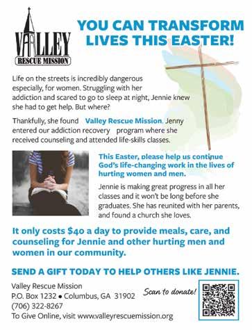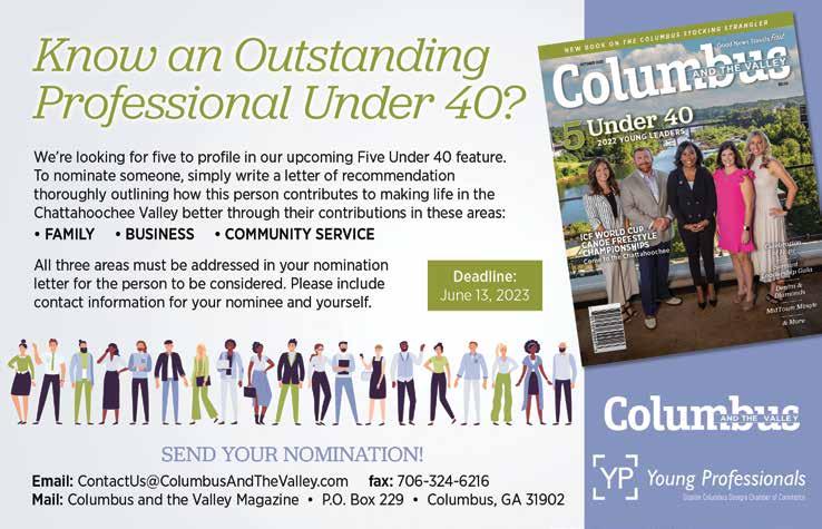 Mike Venable EditorCOLUMBUS AND THE VALLEY MAGAZINE is published bimonthly for $18 per year by Chicken Dinner News, Inc., dba COLUMBUS AND THE VALLEY MAGAZINE, P. O. Box 229, Columbus, GA 31902. The cover and contents are fully protected and may not be reproduced in whole or in part without the written consent of COLUMBUS AND THE VALLEY MAGAZINE. We are not responsible for loss of unsolicited inquiries, manuscripts, photographs, or other materials. They will not be returned unless accompanied by return postage. Editorial contributions and letters should be addressed to COLUMBUS AND THE VALLEY MAGAZINE, Post Office Box 229, Columbus, GA 31902. Copyright © 2023 by Chicken Dinner News, Inc. trading as COLUMBUS AND THE VALLEY MAGAZINE. Postmaster: Please send address corrections to: Post Office Box 229, Columbus, GA 31902.