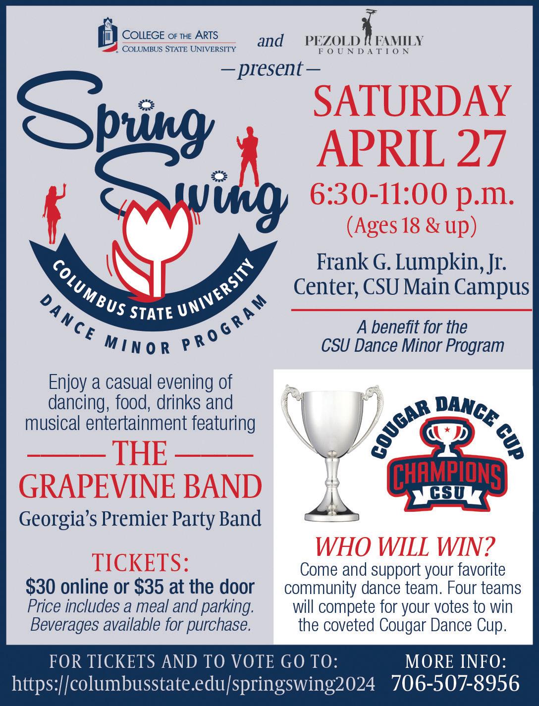 CSU's Spring Swing will bring the Lumpkin Center to life, where guests can dance the night away or just enjoy a casual evening of food, drinks, music and entertainment. Come and applaud your favorite community team as they vie for the coveted Cougar Dance Cup. The Grapevine will be providing the music. Tickets are $30 in advance and $35 at the door.