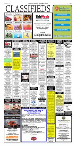 PRODUCE Part-time physical MERCHANDISER therapist/therapist RETAIL GROCERY assistant/Occupational Experience required in Pro therapist/Occupational duce, Merchandising & Su therapy assistant pervision. Must be able to Part-time travel. We offer competi PT/PTA/OT/COTA for tive pay, benefits & home health therapy. Need bonus program. Apply to: coverage on West and hr@savergroup.com South side of Columbus for PT/PTA/OT/COTA. HELP WANTED Home health experience COMPUTERS/ preferred. Must have valid license to practice in Ohio. INFORMATION Excellent per visit rate. SERVICES jkrupar@gmail.com 740-412-3457 Information HELP WANTED Technology GENERAL This position will lead company-wide busi ness process Apartment reengineering efforts in manufacturing process Management es, providing business Positions Available systems analysis and Now! design as a part of process reengineering Hiring couples to co-manage apartment teams, and manage IT communities as well as individuals with general apartment maintenance, leasing, support as a part of the janitorial or housekeeping skills to fill varleadership team in our ious support positions throughout Ohio. Saybrook, Ohio facility. Compensation based on ability/experience and housing is providStrong leadership, facili ed. Mail resume or letter of inquiry to: M. tation, analytical and Oglesbee 45 N. 4th St., Columbus, Ohio communication skills 43215; fax to 614-487-2579; or email to mo glesbee@showemgmt.com EEOC are critical. Bachelor’s degree required; a busi ness, information tech nology, or technical de To place an ad for gree is preferred. Five your bazaar or years related work ex seasonal event call perience, preferrably in a manufacturing envi (740) 888-5003 ronment. Must have (local call) experience with report writing using Crystal Re ports or some similar HELP WANTED tool. Skills in SQL de velopment (SQL Serv MEDICAL/DENTAL er, Oracle, or similar product) are highly de sirable. Interested applicants should send resume to: Human Resources, Mohawk Fine Papers Inc., 6800 Center Road, Ashtabula, Ohio 44004 IT Business Analyst The Columbus Dispatch is seeking an Information Technology Business Analyst to help manage all system development projects and coordinate standard systems among the various Dispatch companies. For more information and to apply, please visit dispatch.com/careers. We are an Equal Employment Opportunity Employer.