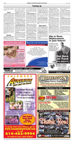 Coming up To add, remove or update a of the month at Scrambler listing, email editorial@thisweek- Marie’s, 6152 Cleveland Ave. CPAs are invited to meet for news.com. lunch. Call (614) 478-8187. Central Ohio Civil War Events Roundtable, 7 p.m. the second Combined Chamber BusiWednesday of each month at the ness Expo, 4:30-7 p.m. ThursOhioHealth Medical Campus, day, June 16, at Bridgewater Ban300 Polaris Parkway. All are welquet and Conference Center, come. Call Tim Maurice at (614) 10561 Sawmill Parkway. This is 818-9175 or visit centraloa joint effort involving the Dublin, hiocwrt.wordpress.com. Powell, Westerville and WorWesterville VFW Post 7883, thington chambers of commerce. 7 p.m. the second Wednesday of Visit www.westervillechamthe month at the American Leber.com or call (614) 882-8917. gion Building, 393 E. College Lunch and Learn, sponsored Ave. Call Walt Mays at 330-2703. by the Westerville Area ChamSoroptimist International of ber of Commerce, 11:30 a.m.Northeast Suburban Franklin 1:30 p.m. Wednesday, June 29, County, an organization for proat the chamber office, 99 Comfessional women, 6:30 p.m. the merce Park Drive. The topic will second Monday of the month at be using QR codes.The cost is the Mifflin Township Adminis$10 for members, $15 for nontrative Building, 155 Olde Ridemembers. Register at www.westnour Road. ervillechamber.com, or call (614) Huber Ridge Area Associa882-8917. tion, 6:30 p.m. first Thursday of the month at Blendon Township Meetings Senior Center, 6330 Hempstead Accountant Information Road. Contact President@huMarket, Worthington-Wester- berridge.org or www.huberville Chapter, 11:45 a.m.-1 p.m. ridge.org. the second and fourth Tuesdays Westerville Sertoma Club,