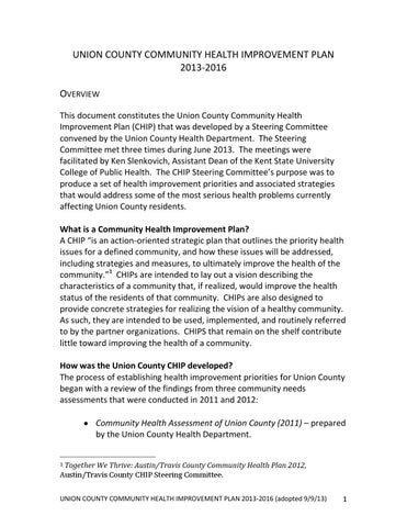 UNION COUNTY COMMUNITY HEALTH IMPROVEMENT PLAN 2013-2016 OVERVIEW This document constitutes the Union County Community Health Improvement Plan (CHIP) that was developed by a Steering Committee convened by the Union County Health Department. The Steering Committee met three times during June 2013. The meetings were facilitated by Ken Slenkovich, Assistant Dean of the Kent State University College of Public Health. The CHIP Steering Committee’s purpose was to produce a set of health improvement priorities and associated strategies that would address some of the most serious health problems currently affecting Union County residents. What is a Community Health Improvement Plan? A CHIP “is an action-oriented strategic plan that outlines the priority health issues for a defined community, and how these issues will be addressed, including strategies and measures, to ultimately improve the health of the community.”1 CHIPs are intended to lay out a vision describing the characteristics of a community that, if realized, would improve the health status of the residents of that community. CHIPs are also designed to provide concrete strategies for realizing the vision of a healthy community. As such, they are intended to be used, implemented, and routinely referred to by the partner organizations. CHIPS that remain on the shelf contribute little toward improving the health of a community. How was the Union County CHIP developed? The process of establishing health improvement priorities for Union County began with a review of the findings from three community needs assessments that were conducted in 2011 and 2012: Community Health Assessment of Union County (2011) – prepared by the Union County Health Department. Together We Thrive: Austin/Travis County Community Health Plan 2012, Austin/Travis County CHIP Steering Committee. 1