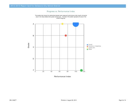 2012-2013 Report Card for Delaware City School District Progress vs. Performance Index This bubble chart shows the relationship between each subgroup's performance index results (horizontal axis) to the Value-Added letter grade (vertical axis). The size of the bubble represents the size of the student subgroup.