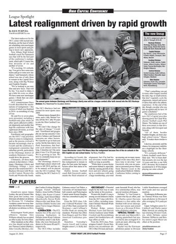 “That’s something you get in many other leagues around the state, big- or small-school, that don’t regularly cycle the alignments, natural and newer rivalries that add to the athletic experience. At the end of the day, though, you play who you line up against and we have 10 games scheduled.” The small-town feel of the new OCC-Capital provides drawing power for Canal Winchester football coach Phil Mauro. The Indians are one of three newcomers to that division, along with Groveport and Newark. “All of them, besides Franklin Heights, are from onehigh school towns,” Mauro said. “It makes them similar to us.” Likewise, proximity and the chance for temporary stability are a highlight for the Olentangy schools. “It’s certainly different,” Liberty football coach Steve Hale said. “We’ve been shuffled around a lot over the last 14 years and this is our fifth (OCC division). We’re kind of accustomed to it. It’ll be unique playing our sister schools.”