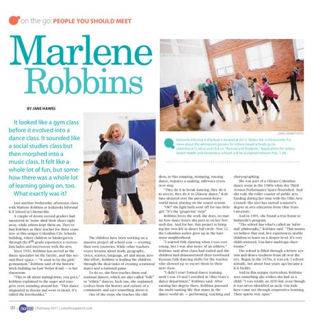 dren, in this romping, stomping, rousing dance, requires a snaking, sideways crossover step. “They do it in break dancing, they do it in soccer, they do it in Chinese dance,” Robbins shouted over the percussion-heavy world music playing on the sound system. “Oh!” the light bulb went off for one little girl. “It’s the ‘grapevine’ step!” Robbins loves the work she does, no matter how many hours she puts in on her feet each day. And for her, this project is bringing her own life in dance full circle. Now 52, the Columbus native grew up in the Eastmoor neighborhood. “I started folk dancing when I was very young, but I was also more of an athlete,” Robbins said after class had ended and the children had demonstrated their newfound Russian folk-dancing skills for the teacher who showed up to escort them to their next class. “I didn’t start formal dance training until I was 19 and I enrolled in Ohio State’s dance department,” Robbins said. After earning her degree there, Robbins pursued the multi-tasking life that many in the dance world do — performing, teaching and