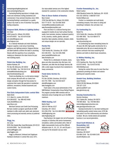 everlastingroofing@sbcglobal.net www.everlastingroofing.com Everlasting Roofing specializes in shingle, slate, metal and membrane roofing (residential and commercial). It has serviced Columbus since 1993. Everlasting Roofing’s commitment to a quality product has made us one of Columbus’ top-quality roofing companies. Ferguson Bath, Kitchen & Lighting Gallery Erin Tober 4363 Lyman Dr., Hilliard, OH 43026 614-876-8555 Fax: 614-876-0156 erin.tober@ferguson.com www.ferguson.com As a national wholesale and retail distributor, Ferguson supplies a vast array of plumbing, appliance and lighting products. Ferguson Kitchen and Bath Galleries combine the latest in plumbing fixtures with the expertise of our consultants, making our showrooms the ideal choice for your next building project. Finish Line Building, Inc. Andrew Hrynkow, CR P.O. Box 96, Kilbourne, OH 43032 614-734-9886 Fax: 740-524-5118 andrew@finishlinebuilding.com www.finishlinebuilding.com Finish Line Building, Inc. is a full-service design/ build company. We work with our clients from design conception through the final product to customize their needs. We specialize in residential additions, renovations, finished basements and custom homes. First Data Independent Sales central Ohio Mark Elliott 11 S. Main St., London, OH 43140 614-206-8332 Fax: 888-402-4440 mark.elliott@fdisco.com www.fdisco.com Merchant Services and Credit Card Processing. We have created a program specifically for NARI members to offer credit card, debit card, electronic check processing and warranty services at preferred rates. Flagg, Inc. Jon Locey 6535 Oley Speaks Way, Canal Winchester, OH 43110 614-834-5656 Fax: 614-834-4280 jonlocey@flagginc.com www.flagginc.com Flagg is a Wilsonart, Uniboard and Sugatsune Hardware distributor in central Ohio since 1971. 42 RENOVATIONS • 2014