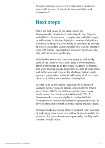 Next steps This is the first survey of the profession in the Commonwealth to have been undertaken in over 30 years and while it is by no means comprehensive and relies largely on self-reports, its findings highlight a number of significant challenges to the professions ability to contribute to delivery of a more sustainable Commonwealth. The CAA will therefore work with member organisations and other stakeholders to help address the principal findings. While further research is clearly necessary to both verify some of the survey’s results and secure a wider response, action clearly needs to be taken now to address its findings and, while much is already being done in some of these areas, such is the scale and scope of the challenge that no single agency is going to be capable of addressing all of the issues raised or achieving the transformation required. In order to do so, innovative responses will be required involving partnerships and collaborations between INGO’s, governments, NGO’s, the built environment professions, academia and the private sector. With nearly 75% of Commonwealth country’s eligible to received Official Development Assistance (ODA) finance, opportunities exist to develop programmes which will have lasting impact at scale. Tomorrow’s cities are being planned and built today and only by addressing these issues now will we be able to realise the potential of urbanisation to create prosperity, stability and a truly sustainable future.