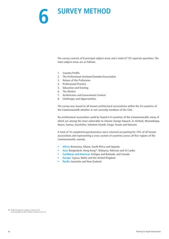 The survey was issued to all known architectural associations within the 53 countries of the Commonwealth whether or not currently members of the CAA. No architectural association could be found in 8 countries of the Commonwealth, many of which are among the most vulnerable to climate change impacts, ie: Kiribati, Mozambique, Nauru, Samoa, Seychelles, Solomon Islands, Tonga, Tuvalu and Vanuatu. A total of 16 completed questionnaires were returned accounting for 33% of all known associations and representing a cross section of countries across all five regions of the Commonwealth, namely: • • • • •