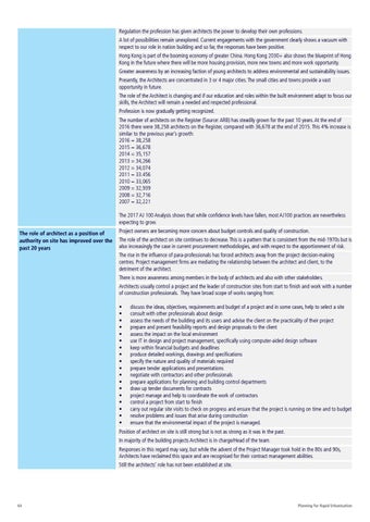 Regulation the profession has given architects the power to develop their own professions. A lot of possibilities remain unexplored. Current engagements with the government clearly shows a vacuum with respect to our role in nation building and so far, the responses have been positive. Hong Kong is part of the booming economy of greater China. Hong Kong 2030+ also shows the blueprint of Hong Kong in the future where there will be more housing provision, more new towns and more work opportunity. Greater awareness by an increasing faction of young architects to address environmental and sustainability issues. Presently, the Architects are concentrated in 3 or 4 major cities. The small cities and towns provide a vast opportunity in future. The role of the Architect is changing and if our education and roles within the built environment adapt to focus our skills, the Architect will remain a needed and respected professional. Profession is now gradually getting recognized. The number of architects on the Register (Source: ARB) has steadily grown for the past 10 years. At the end of 2016 there were 38,258 architects on the Register, compared with 36,678 at the end of 2015. This 4% increase is similar to the previous year’s growth: 2016 = 38,258 2015 = 36,678 2014 = 35,157 2013 = 34,266 2012 = 34,074 2011 = 33.456 2010 = 33,065 2009 = 32,939 2008 = 32,716 2007 = 32,221 The 2017 AJ 100 Analysis shows that while confidence levels have fallen, most AJ100 practices are nevertheless expecting to grow. The role of architect as a position of authority on site has improved over the past 20 years