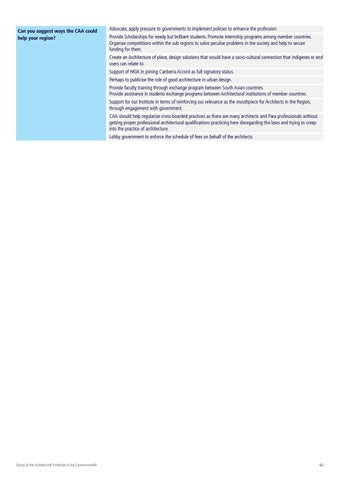 Advocate, apply pressure to governments to implement policies to enhance the profession Provide Scholarships for needy but brilliant students. Promote internship programs among member countries. Organise competitions within the sub regions to solve peculiar problems in the society and help to secure funding for them. Create an Architecture of place, design solutions that would have a socio-cultural connection that indigenes or end users can relate to. Support of HKIA in joining Canberra Accord as full signatory status. Perhaps to publicise the role of good architecture in urban design. Provide faculty training through exchange program between South Asian countries. Provide assistance in students exchange programs between Architectural institutions of member countries. Support for our Institute in terms of reinforcing our relevance as the mouthpiece for Architects in the Region, through engagement with government. CAA should help regularize cross-boarded practices as there are many architects and Para professionals without getting proper professional architectural qualifications practicing here disregarding the laws and trying to creep into the practice of architecture. Lobby government to enforce the schedule of fees on behalf of the architects.