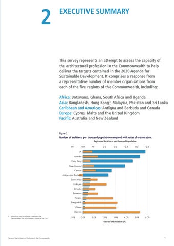 This survey represents an attempt to assess the capacity of the architectural profession in the Commonwealth to help deliver the targets contained in the 2030 Agenda for Sustainable Development. It comprises a response from a representative number of member organisations from each of the five regions of the Commonwealth, including: Africa: Botswana, Ghana, South Africa and Uganda Asia: Bangladesh, Hong Kong5, Malaysia, Pakistan and Sri Lanka Caribbean and Americas: Antigua and Barbuda and Canada Europe: Cyprus, Malta and the United Kingdom Pacific: Australia and New Zealand