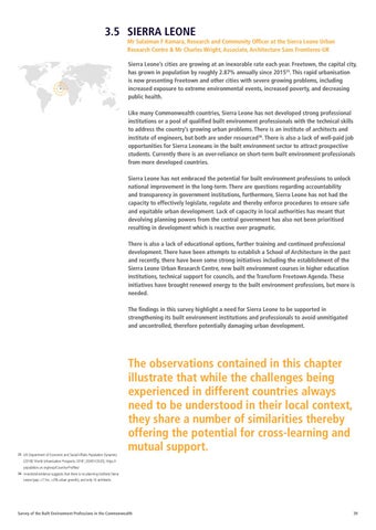 Mr Sulaiman F Kamara, Research and Community Officer at the Sierra Leone Urban Research Centre & Mr Charles Wright, Associate, Architecture Sans Frontieres-UK Sierra Leone’s cities are growing at an inexorable rate each year. Freetown, the capital city, has grown in population by roughly 2.87% annually since 201535. This rapid urbanisation is now presenting Freetown and other cities with severe growing problems, including increased exposure to extreme environmental events, increased poverty, and decreasing public health. Like many Commonwealth countries, Sierra Leone has not developed strong professional institutions or a pool of qualified built environment professionals with the technical skills to address the country’s growing urban problems. There is an institute of architects and institute of engineers, but both are under resourced36. There is also a lack of well-paid job opportunities for Sierra Leoneans in the built environment sector to attract prospective students. Currently there is an over-reliance on short-term built environment professionals from more developed countries. Sierra Leone has not embraced the potential for built environment professions to unlock national improvement in the long-term. There are questions regarding accountability and transparency in government institutions, furthermore, Sierra Leone has not had the capacity to effectively legislate, regulate and thereby enforce procedures to ensure safe and equitable urban development. Lack of capacity in local authorities has meant that devolving planning powers from the central government has also not been prioritised resulting in development which is reactive over pragmatic. There is also a lack of educational options, further training and continued professional development. There have been attempts to establish a School of Architecture in the past and recently, there have been some strong initiatives including the establishment of the Sierra Leone Urban Research Centre, new built environment courses in higher education institutions, technical support for councils, and the Transform Freetown Agenda. These initiatives have brought renewed energy to the built environment professions, but more is needed. The findings in this survey highlight a need for Sierra Leone to be supported in strengthening its built environment institutions and professionals to avoid unmitigated and uncontrolled, therefore potentially damaging urban development.