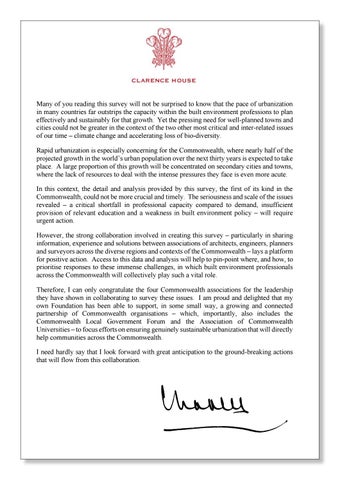 Many of you reading this survey will not be surprised to know that the pace of urbanization in many countries far outstrips the capacity within the built environment professions to plan effectively and sustainably for that growth. Yet the pressing need for well-planned towns and cities could not be greater in the context of the two other most critical and inter-related issues of our time – climate change and accelerating loss of bio-diversity. Rapid urbanization is especially concerning for the Commonwealth, where nearly half of the projected growth in the world’s urban population over the next thirty years is expected to take place. A large proportion of this growth will be concentrated on secondary cities and towns, where the lack of resources to deal with the intense pressures they face is even more acute. In this context, the detail and analysis provided by this survey, the first of its kind in the Commonwealth, could not be more crucial and timely. The seriousness and scale of the issues revealed – a critical shortfall in professional capacity compared to demand, insufficient provision of relevant education and a weakness in built environment policy – will require urgent action. However, the strong collaboration involved in creating this survey – particularly in sharing information, experience and solutions between associations of architects, engineers, planners and surveyors across the diverse regions and contexts of the Commonwealth – lays a platform for positive action. Access to this data and analysis will help to pin-point where, and how, to prioritise responses to these immense challenges, in which built environment professionals across the Commonwealth will collectively play such a vital role. Therefore, I can only congratulate the four Commonwealth associations for the leadership they have shown in collaborating to survey these issues. I am proud and delighted that my own Foundation has been able to support, in some small way, a growing and connected partnership of Commonwealth organisations – which, importantly, also includes the Commonwealth Local Government Forum and the Association of Commonwealth Universities – to focus efforts on ensuring genuinely sustainable urbanization that will directly help communities across the Commonwealth. I need hardly say that I look forward with great anticipation to the ground-breaking actions that will flow from this collaboration.