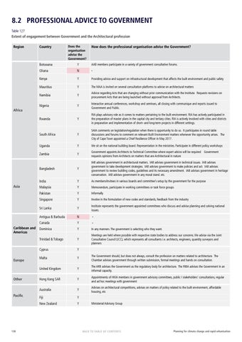 8.2 PROFESSIONAL ADVICE TO GOVERNMENT Table 127 Extent of engagement between Government and the Architectural profession Region