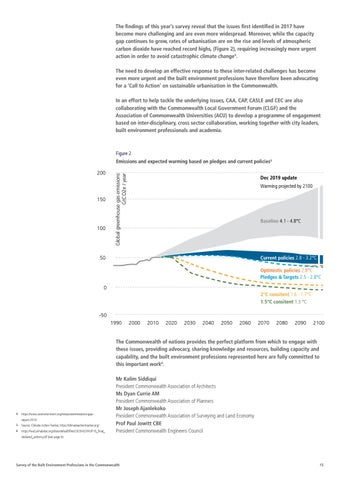 The findings of this year’s survey reveal that the issues first identified in 2017 have become more challenging and are even more widespread. Moreover, while the capacity gap continues to grow, rates of urbanisation are on the rise and levels of atmospheric carbon dioxide have reached record highs, (Figure 2), requiring increasingly more urgent action in order to avoid catastrophic climate change4. The need to develop an effective response to these inter-related challenges has become even more urgent and the built environment professions have therefore been advocating for a ‘Call to Action’ on sustainable urbanisation in the Commonwealth. In an effort to help tackle the underlying issues, CAA, CAP, CASLE and CEC are also collaborating with the Commonwealth Local Government Forum (CLGF) and the Association of Commonwealth Universities (ACU) to develop a programme of engagement based on inter-disciplinary, cross sector collaboration, working together with city leaders, built environment professionals and academia.