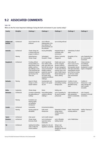 9.2 ASSOCIATED COMMENTS Table 148 What are the five most important challenges facing the built environment in your country today? Country