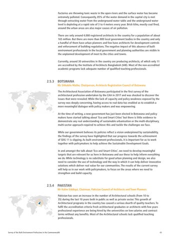 Ms Sithabile Mathe, Chairperson, Architects Registration Council of Botswana The Architectural Association of Botswana participated in the first survey of the architectural profession undertaken by the CAA in 2017 and was shocked to discover the issues that were revealed. While the lack of capacity and policy weakness exposed by the survey was deeply concerning, having access to real data has enabled us to establish a more meaningful dialogue with policy makers and was empowering. At the time of writing, a new government has just been elected in Botswana and policy makers have started talking about ‘Eco and Smart Cities’ but there is little evidence to demonstrate any real understanding of sustainable urbanisation or the multi-disciplinary, multi-sector approach required to achieve this and tackle the challenges we face. While our government believes its policies reflect a vision underpinned by sustainability, the findings of the survey have highlighted that our progress towards the achievement of SDG 11 is slipping. As built environment professionals, it is important for us to work together with policymakers to help achieve the Sustainable Development Goals. In and amongst the talk about ‘Eco and Smart Cities’, we need to develop meaningful targets that are relevant for us here in Botswana and use these to help inform everything we do. While technology is no substitute for good urban planning and design, we also need to consider the use of technology and the way in which it can help deliver innovative solutions which deliver real value for our communities. The results of the current survey will help us in our work with policymakers, to focus on the areas where we need to strengthen and build capacity.