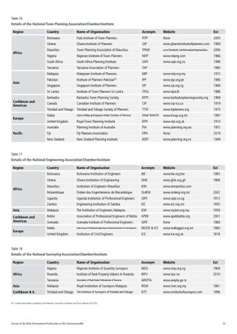 Table 16 Details of the National Town Planning Association/Chamber/Institute Region