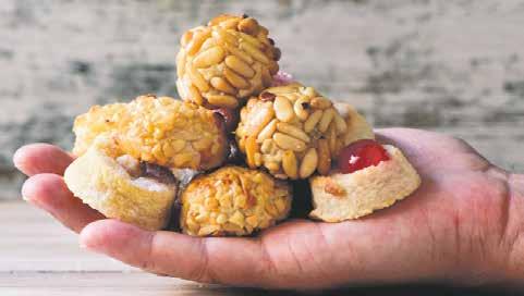 Batrem 2 ous. Ho dividirem en dos plats de sopa. En un hi posarem l'ametlla i en l'altre, els pinyons. Ho remenarem tot bé. Arrebossarem les bolets amb pinyons i els bastonets, amb ametlles. Ens haurem d'ajudar amb les mans per anar clavant les ametlles i sobretot els pinyons. Els posarem a coure al forn amb paper sulfurat, 10 minuts a 200 graus.