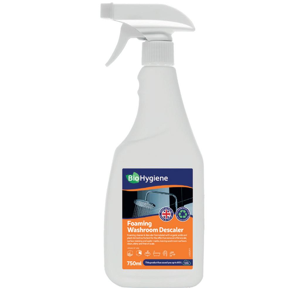 BioHygiene Foaming Washroom Descaler is the easy way to remove limescale build up from tough washroom environments. Made with organic acids and plant derived surfactants, the powerful formula quickly lifts and removes scale and soiling for a long-lasting deep clean.