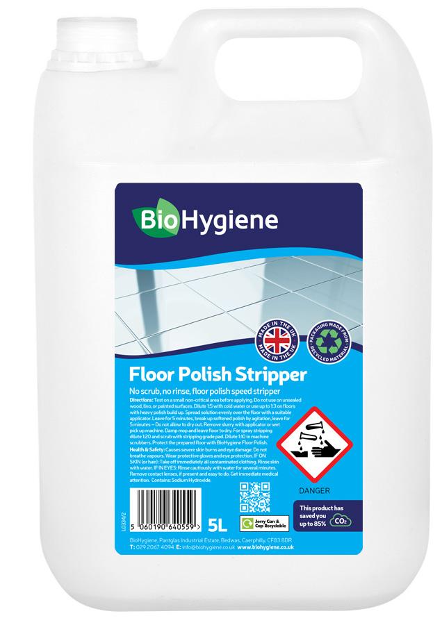 Restore your flooring with BioHygiene Floor Polish Stripper. The eco-friendly, alkaline formula quickly dissolves old coats and heavy build-up of polish, wax, cross polymer, acrylic and clear finishes, leaving behind a smooth, clean surface.