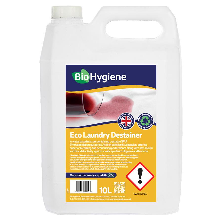 BioHygiene Eco Laundry Destainer is an environmentally friendly, water-based destainer offering superior bleaching and deodorising performance along with antimicrobial activity against a wide spectrum of
