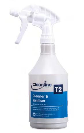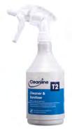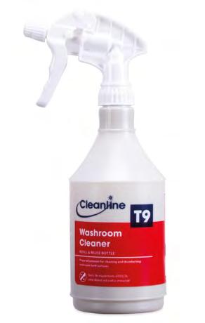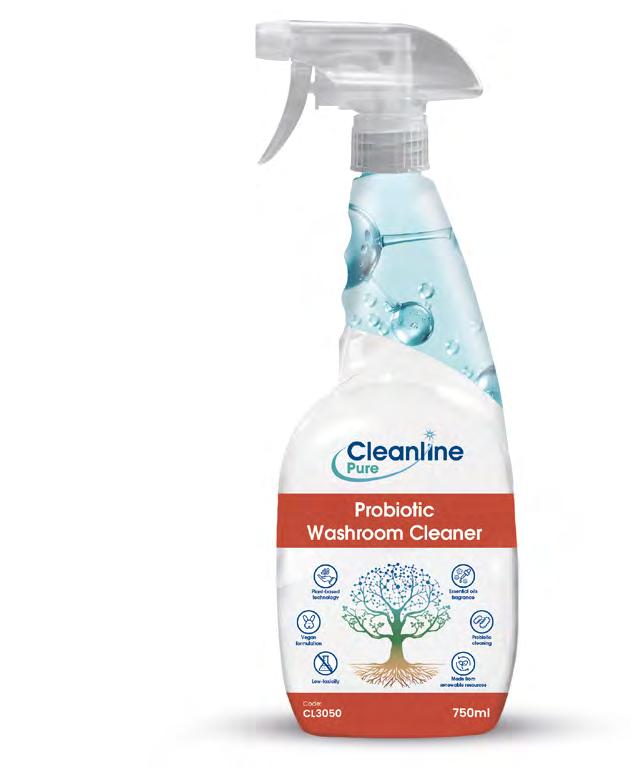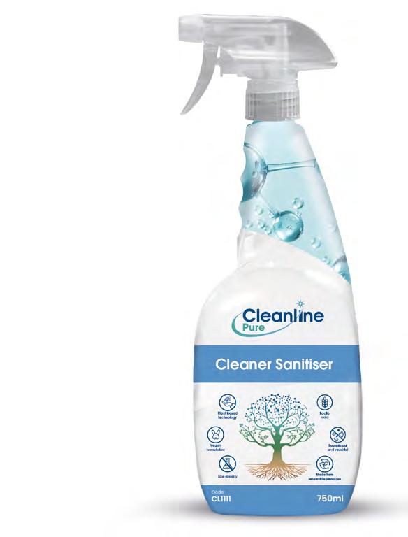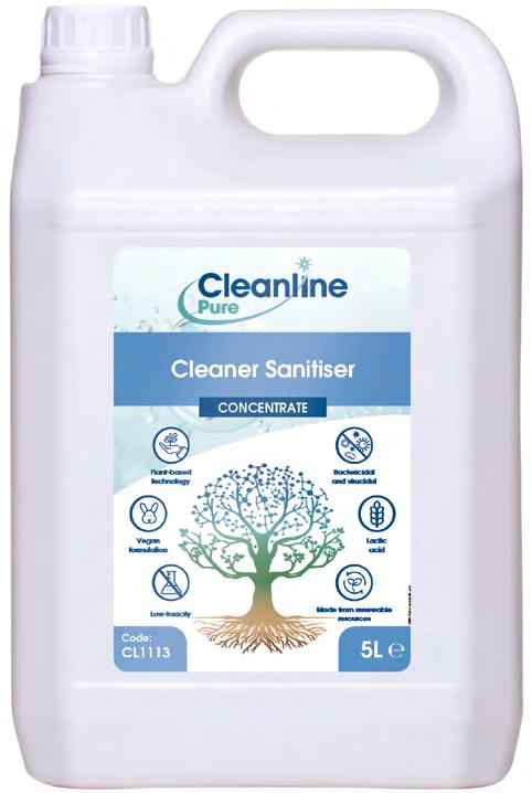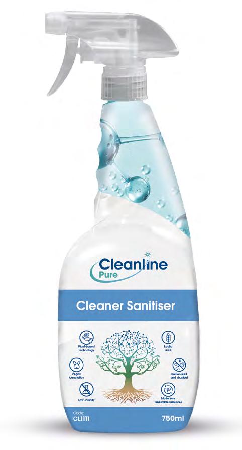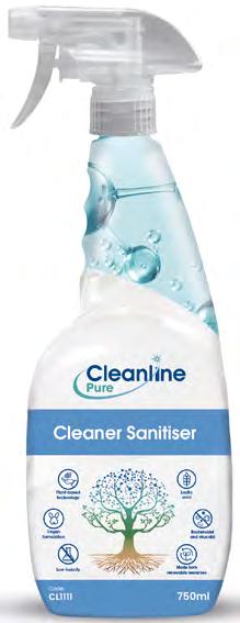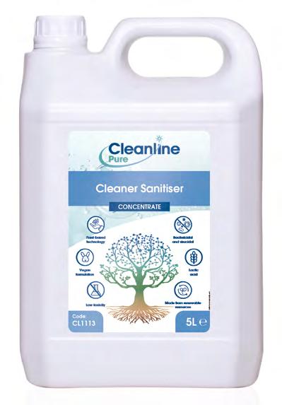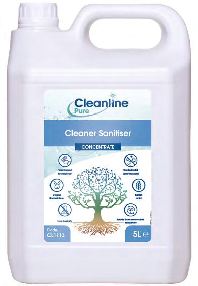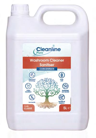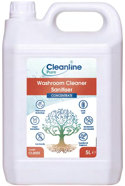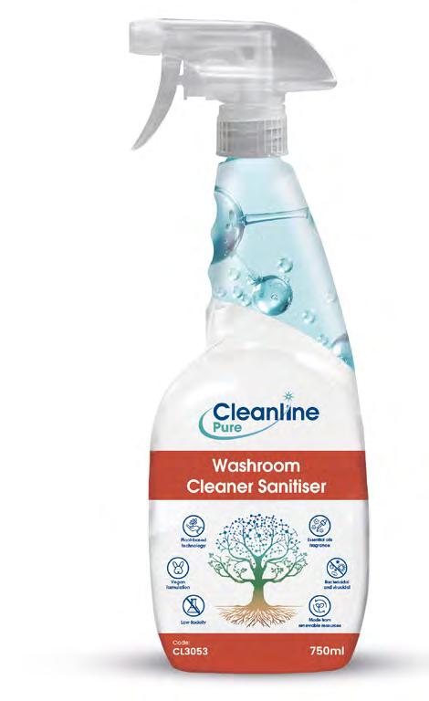 Cleanline Pure Washroom Cleaner Sanitiser is a fragranced, readyto-use, natural active-based sanitiser for dual-action cleaning and disinfection of all washroom hard surfaces.