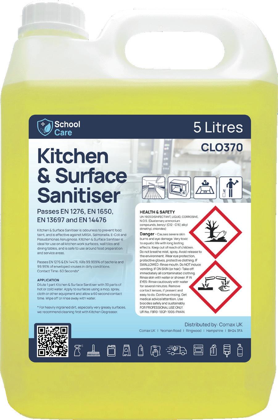 SchoolCare® Kitchen & Surface Sanitiser is odourless to prevent food taint, and is effective against MRSA, Salmonella, E-Coli and Pseudomonas Aeruginosa.