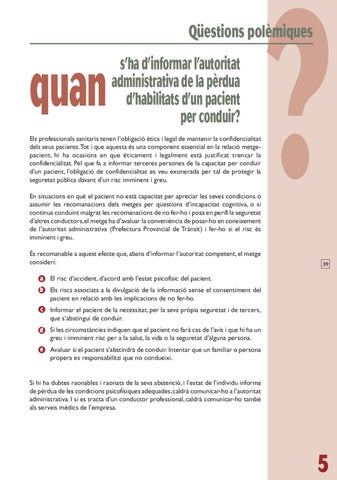 Els professionals sanitaris tenen l’obligació ètica i legal de mantenir la confidencialitat dels seus pacients.Tot i que aquesta és una component essencial en la relació metgepacient, hi ha ocasions en que èticament i legalment està justificat trencar la confidencialitat. Pel que fa a informar terceres persones de la capacitat per conduir d’un pacient, l’obligació de confidencialitat es veu exonerada per tal de protegir la seguretat pública davant d’un risc imminent i greu. En situacions en què el pacient no està capacitat per apreciar les seves condicions o assumir les recomanacions dels metges per qüestions d’incapacitat cognitiva, o si continua conduint malgrat les recomanacions de no fer-ho i posa en perill la seguretat d’altres conductors, el metge ha d’avaluar la conveniència de posar-ho en coneixement de l’autoritat administrativa (Prefectura Provincial de Trànsit) i fer-ho si el risc és imminent i greu. És recomanable a aquest efecte que, abans d’informar l’autoritat competent, el metge consideri: